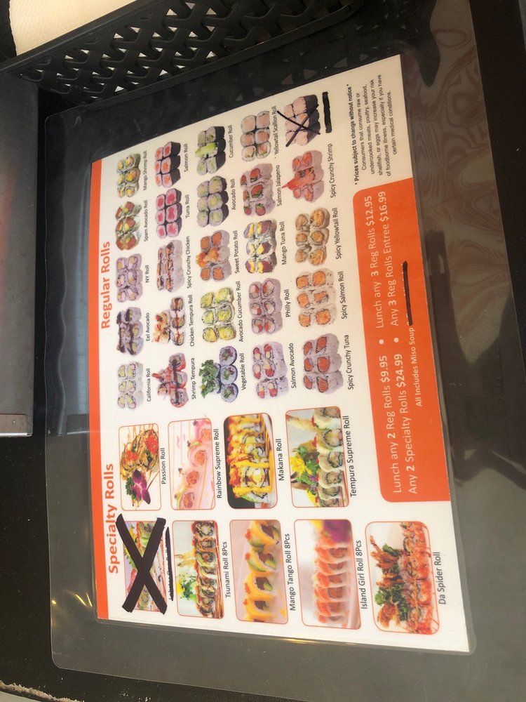 C sushi party tray for 68 people. It includes 1 Mango Tango Roll 8 piece 1 Makana Roll 8 piece 1 California Roll 6 piece 1 Shrimp Tempura Roll 5 piece 1 spicy Crunchi chicken Roll 5 piece 1 Eel Avocado Roll 6 piece 1 New York Roll 6 piece 1 Salmon Avocado Roll 5 piece 1 Sweet Potato Roll 6 piece 1 mango avocado Roll 5 piece 1 philly roll 6 piece 1 spicy tuna roll 6 pcs 1 spicy crunchy carb roll 6pcs
